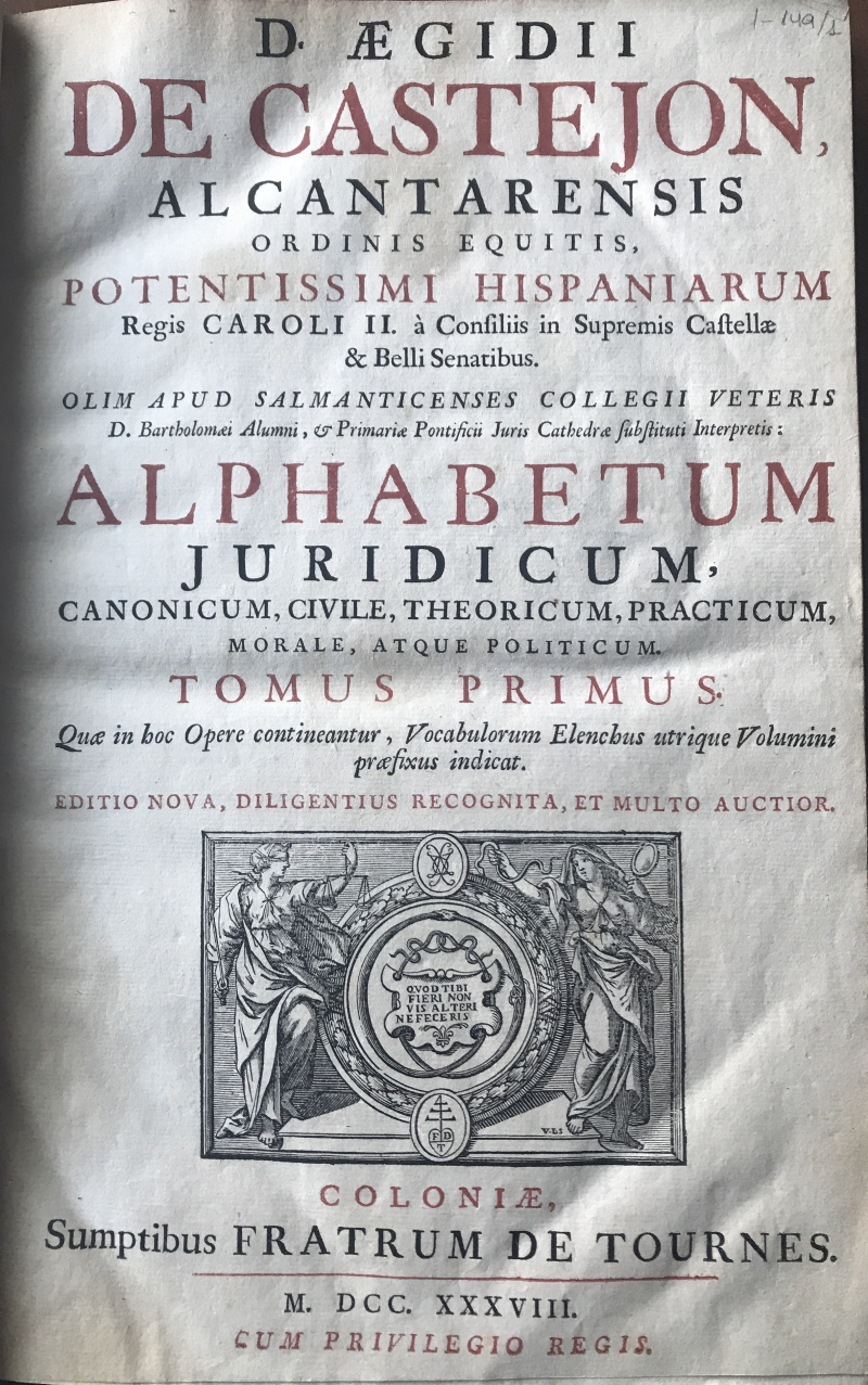 Entre las obras jurídicas que conforman el fondo antiguo de la Biblioteca de la Universidad Rey Juan Carlos, el Alphabetum juridicum de Gil de Castejón, en su edición de 1738, ocupa un lugar destacado tanto por su contenido como por su cuidada factura editorial.